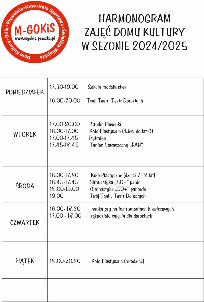 / harmonogram zajęć w Domu Kultury w roku 2024/2025